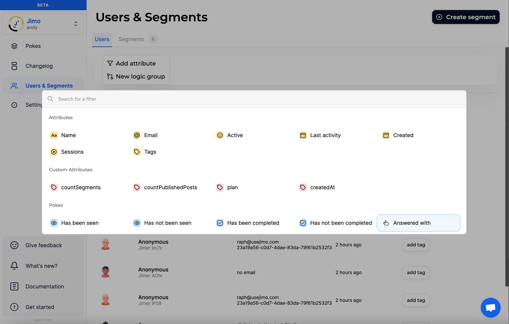 Jimo helps you reach your users very contextually, resulting in higher engagements from users and higher-quality feedback. To do this, you might want to base your segmentation on the responses users gave to previous surveys you showed them.