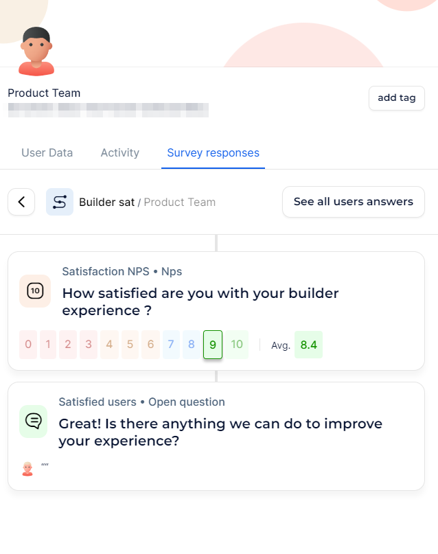 * Clicking on a survey entry displays detailed responses for each step, including here NPS scores and open-ended feedback.