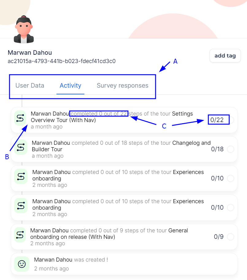 * **Tour Progress**: Shows the progress of the user in specific tours. This includes the number of steps completed out of the total steps.