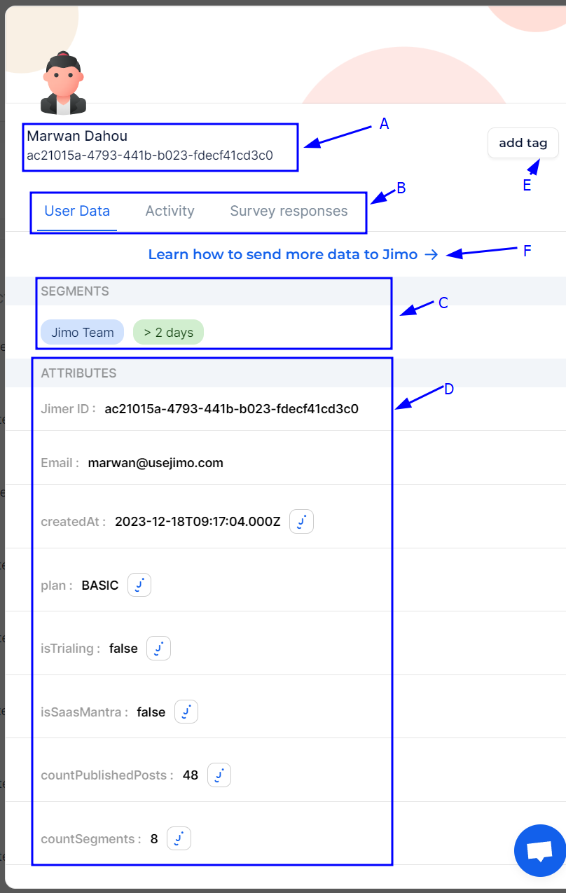 * **Add Tag**: Button to add a new tag to the user for better categorization and segmentation.