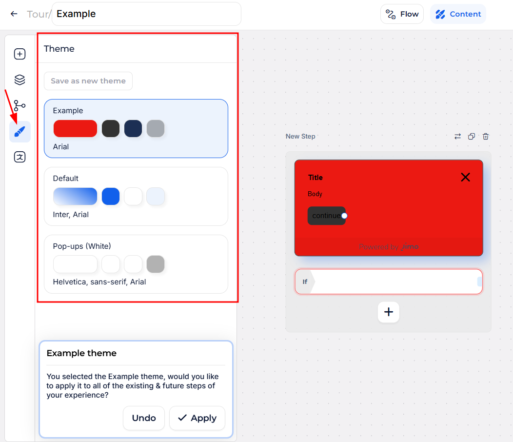 > 📌 To define and apply themes, check the [**Theme Page**](https://help.usejimo.com/docs/build/theme).