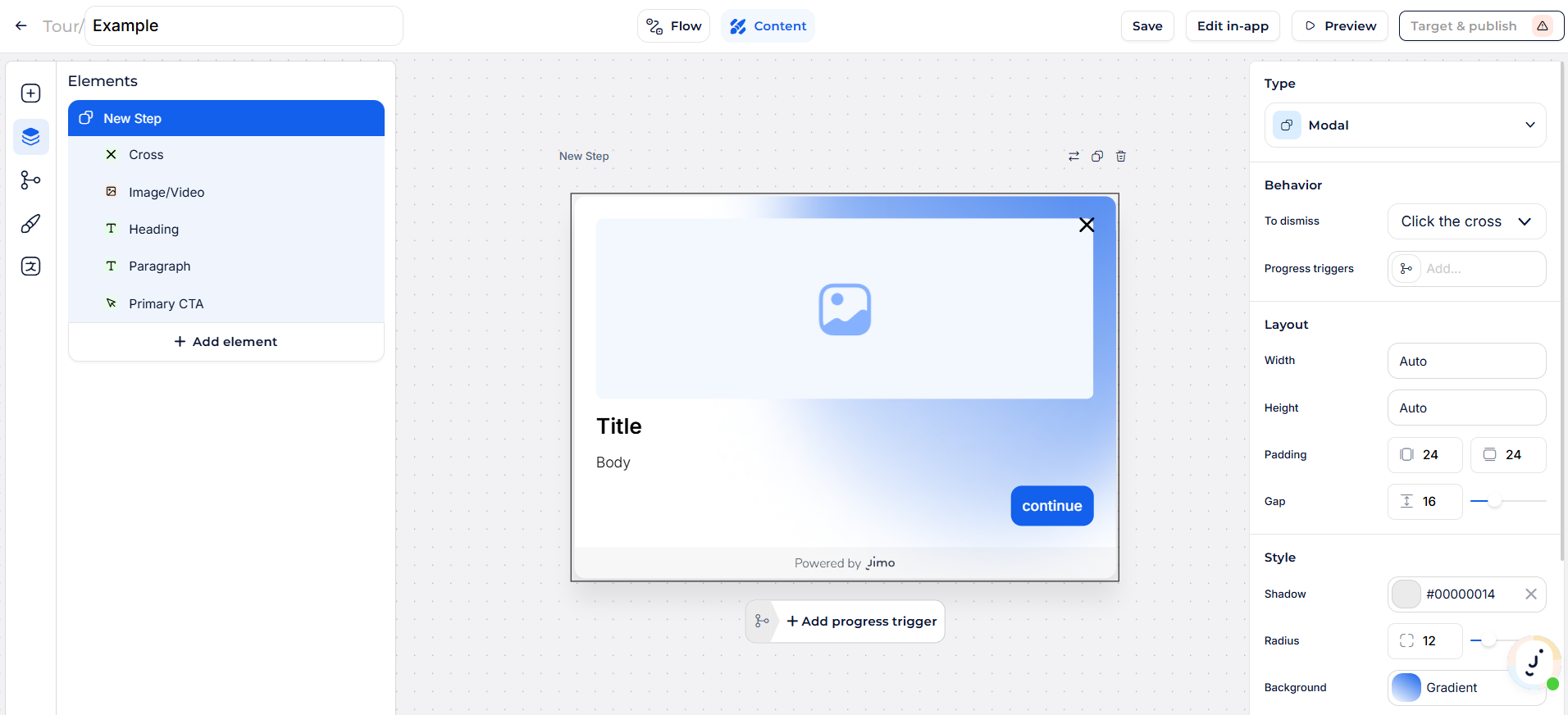 * **Tours & Surveys**: Once you add your first step in the Flow Builder, you're directed to the Content Builder to edit it.