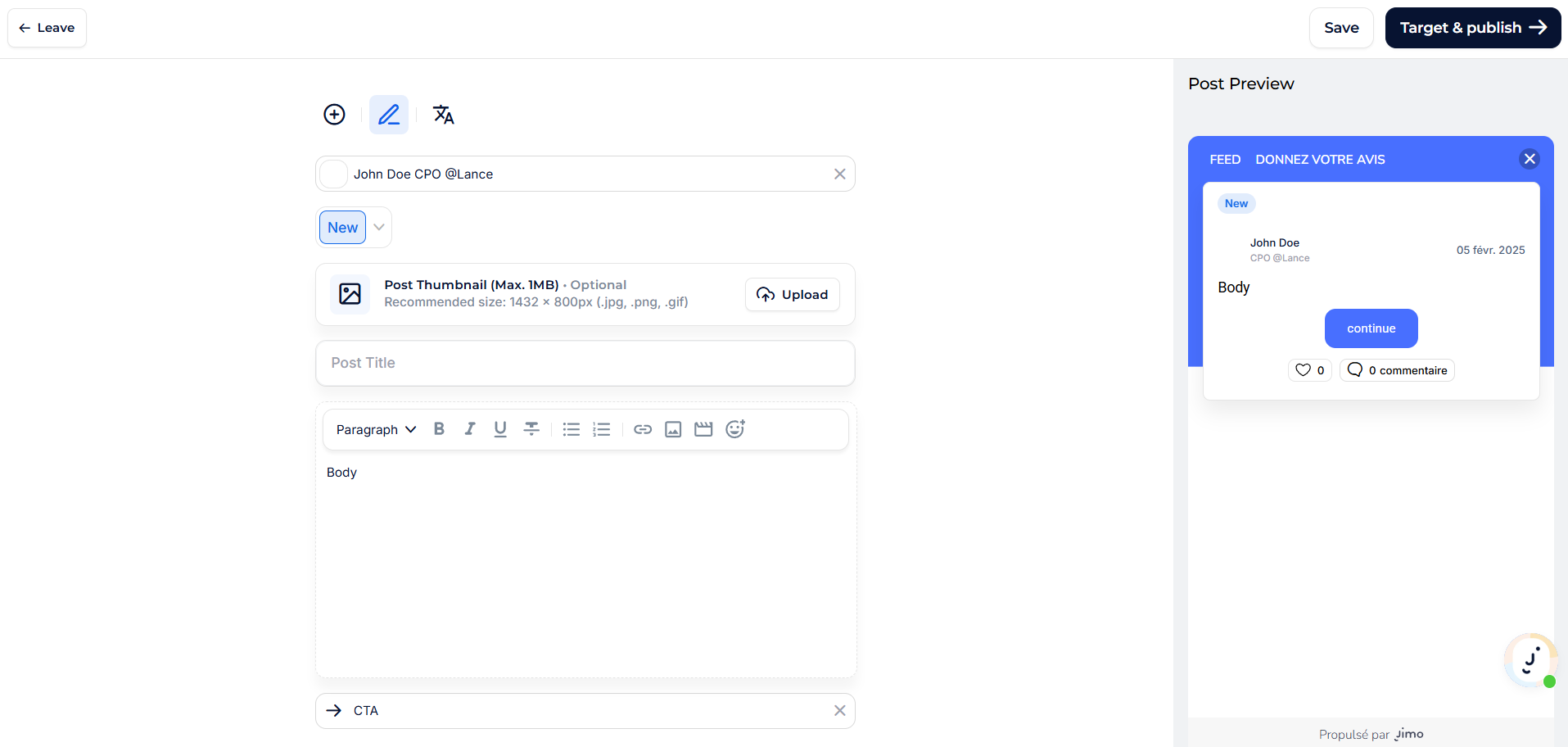 For **Changelog Posts**, as there's no navigator, the "Add elements" is replaced by a **“+” button** directly in the Builder Menu and all elements are directly displayed in the post builder main view.