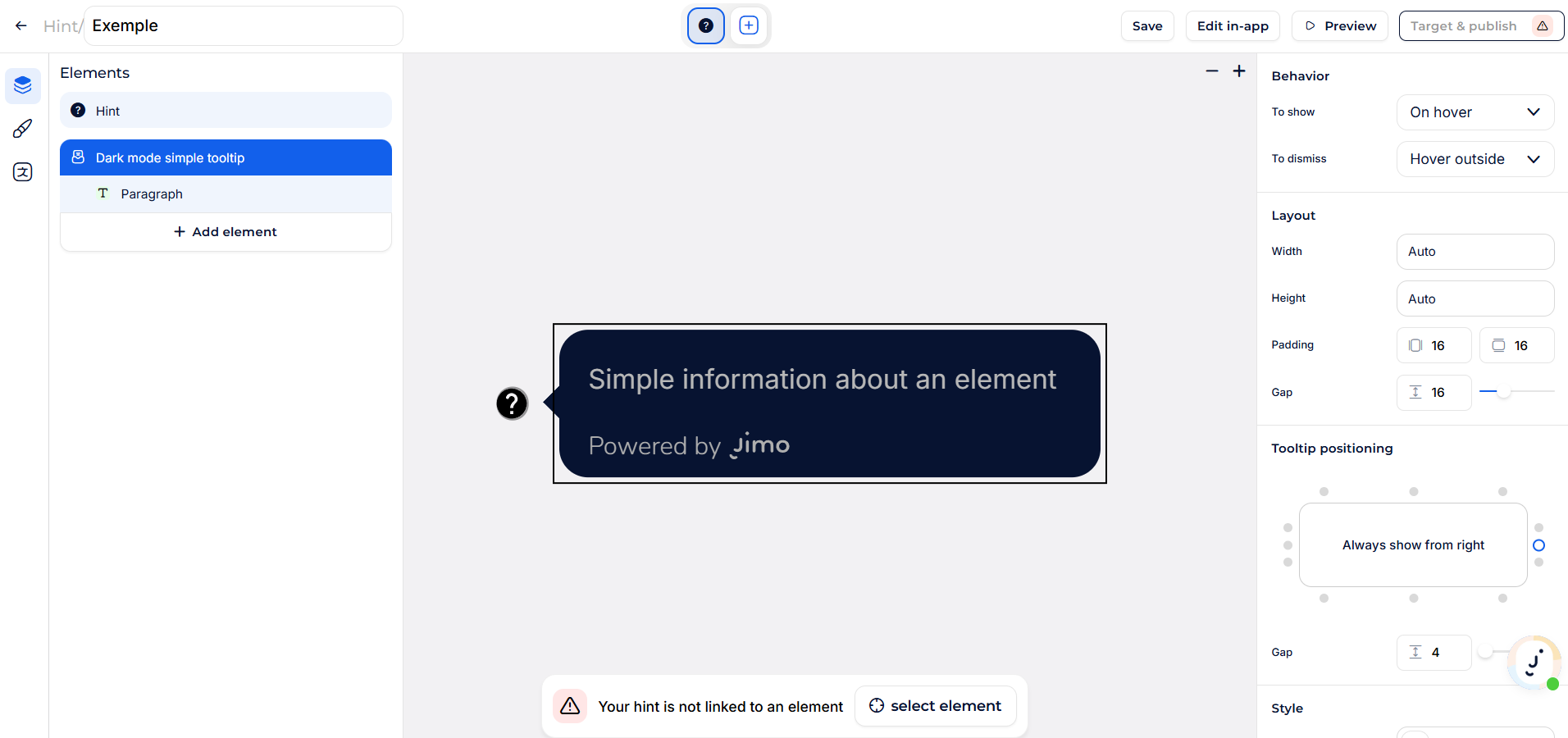 > 📌 If you need advanced positioning, check out the [**Positioning Page**](https://help.usejimo.com/docs/build/positioning) for in-depth customization options.