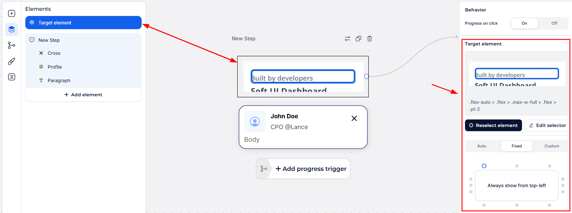 * Targeting options include **specific UI elements, relative placement, and auto-positioning**.