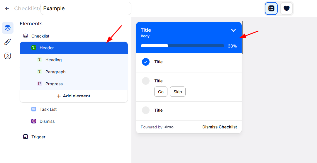 > &#x20;     ⇒ [Tours & Modals](https://help.usejimo.com/docs/experiences/tours-and-modals/components) - [Surveys](https://help.usejimo.com/docs/experiences/surveys/components) - [Banners](https://help.usejimo.com/docs/experiences/banners/components) - [Hints](https://help.usejimo.com/docs/experiences/hints/components) - [Checklists](https://help.usejimo.com/docs/experiences/checklists/components) - [Changelog](https://help.usejimo.com/docs/experiences/changelog/changelog/changelog-components) - [Changelog posts](https://help.usejimo.com/docs/experiences/changelog/posts/post-components)