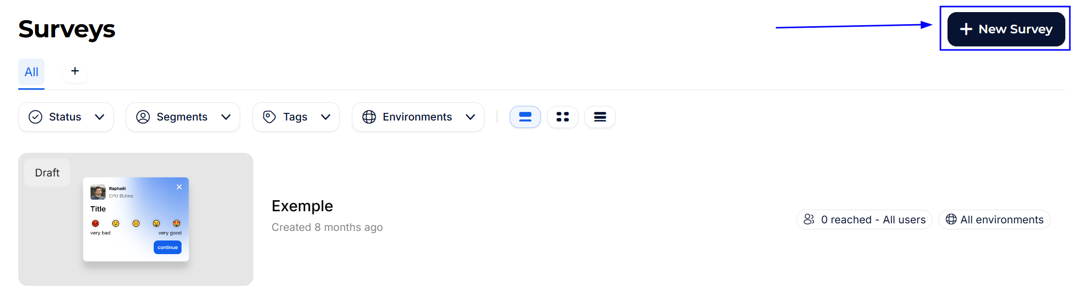 * From your [Jimo dashboard](https://help.usejimo.com/docs/build/dashboard), go to [**Surveys**](https://i.usejimo.com/surveys).