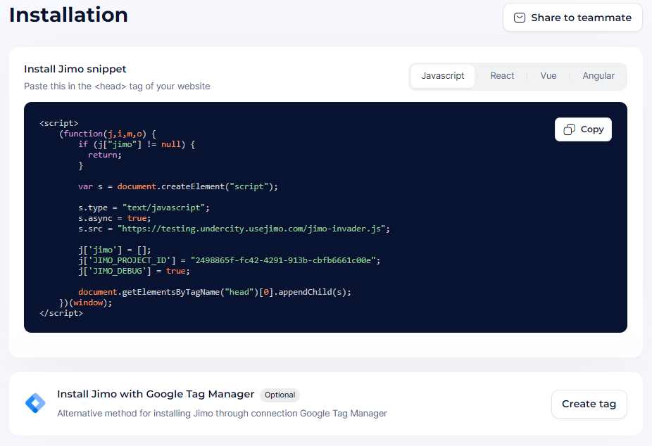 Access the Installation Tab: In your Jimo settings, locate the 'Installation' section to find your custom script snippet.